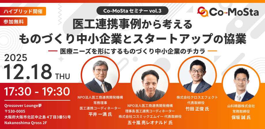 12/18開催 Co-MoStaセミナーvol.3「医工連携事例から考えるものづくり中小企業とスタートアップの協業」